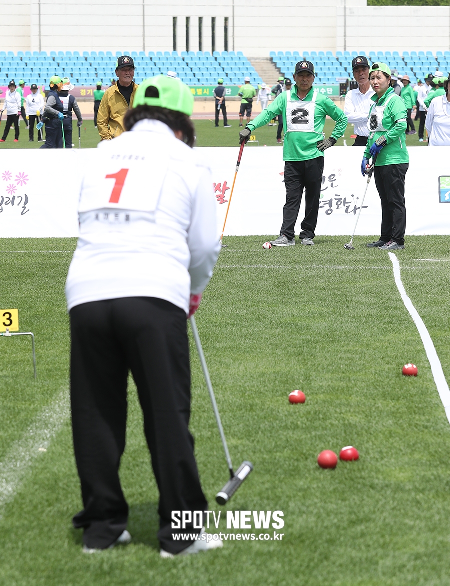 [스포티비뉴스=철원, 곽혜미 기자] 제 17회 대통령기 생활체육 전국게이트볼대회가 15일 오후 강원도 철원종합운동장에서 열렸다. 참가자들이 상대팀의 타격을 지켜보고 있다. 스포티비뉴스=철원, 곽혜미 기자