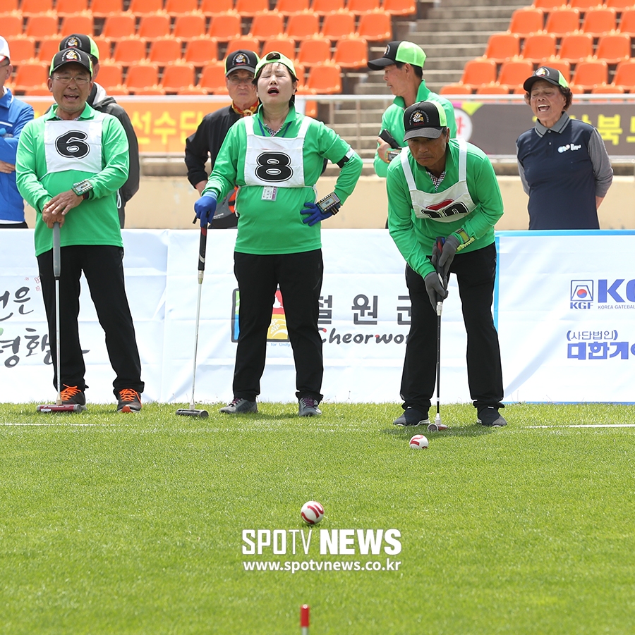 [스포티비뉴스=철원, 곽혜미 기자] 제 17회 대통령기 생활체육 전국게이트볼대회가 15일 오후 강원도 철원종합운동장에서 열렸다. 참가자가 타격을 하고 있다. 스포티비뉴스=철원, 곽혜미 기자