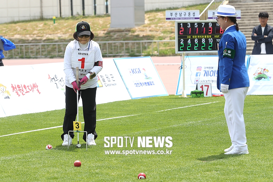 [스포티비뉴스=철원, 곽혜미 기자] 제 17회 대통령기 생활체육 전국게이트볼대회가 15일 오후 강원도 철원종합운동장에서 열렸다. 참가자가 타격을 하고 있다. 스포티비뉴스=철원, 곽혜미 기자
