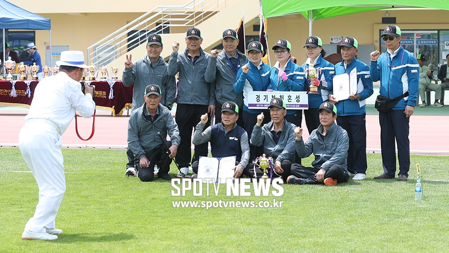 [스포티비뉴스=철원, 곽혜미 기자] 제 17회 대통령기 생활체육 전국게이트볼대회가 15일 오후 강원도 철원종합운동장에서 열렸다. 참가자들이 기념 촬영을 하고 있다. 스포티비뉴스=철원, 곽혜미 기자