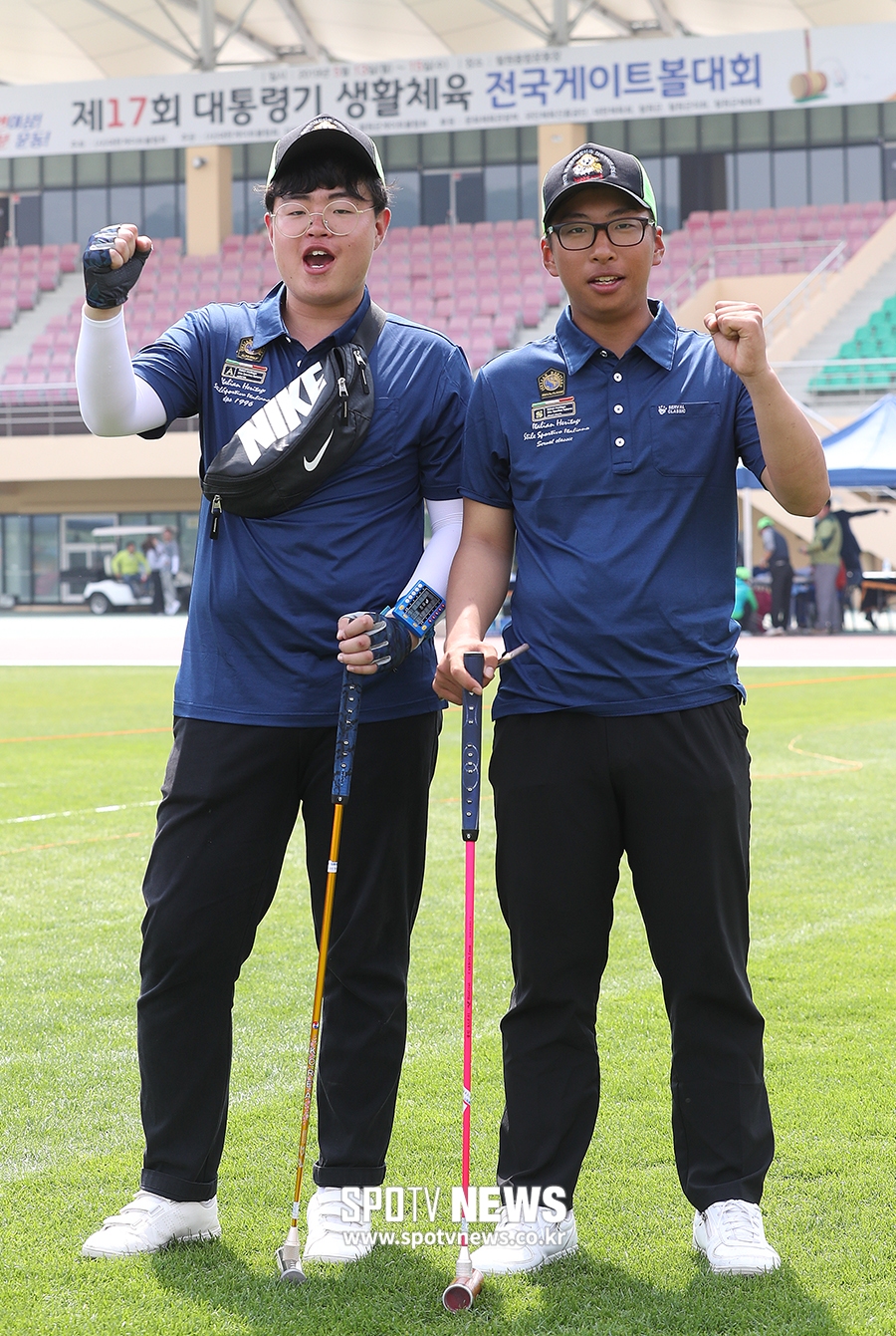 [스포티비뉴스=철원, 곽혜미 기자] 제 17회 대통령기 생활체육 전국게이트볼대회가 15일 오후 강원도 철원종합운동장에서 열렸다. 남자부 우승을 거둔 강원도 홍천A 김동민(20), 한경호(20)씨가 인터뷰 전 포즈를 취하고 있다. 스포티비뉴스=철원, 곽혜미 기자