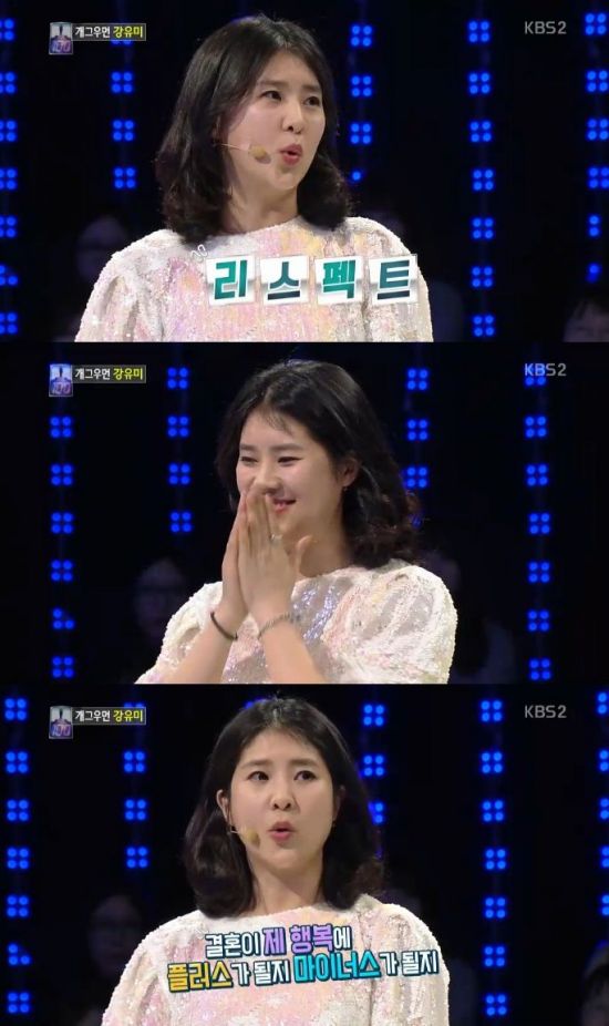 이런 가운데, 지난해 강유미가 자신을 ‘비혼주의’라고 말한 것도 재조명되고 있다. 지난해 4월 KBS2 예능 프로그램 ‘1대100’에 1인으로 출연한 강유미는 100인과 대결을 펼쳤다. 이날 MC 조충현은 강유미에게 “강유미 씨는 결혼에 대한 생각이 있냐"고 질문했다. 당시 강유미는 "아직은 비혼주의에 가까운 것 같다"며 "결혼이 제 행복에 플러스가 될지 마이너스가 될지 잘 모르겠다"고 설명한 바 있다. 이어 그는 사내 연애에 관해 "저는 사내 연애 좋다고 생각하지만, 저한테 적극적으로 대시하는 개그맨이 없다"며 너스레를 떨었다.