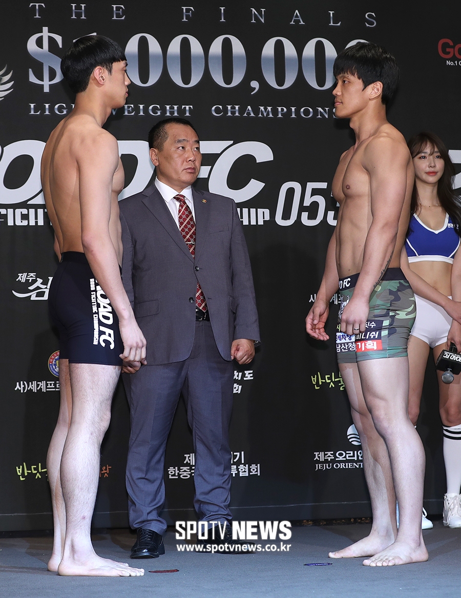 [스포티비뉴스=제주, 곽혜미 기자] ROAD FC 053 제주 계체량이 17일 오후 제주 제주시 삼도동 오리엔탈호텔에서 열렸다. -77kg 웰터급 윤태영과 임병하가 포즈를 취하고 있다.