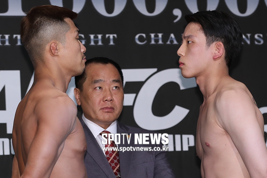 [스포티비뉴스=제주, 곽혜미 기자] ROAD FC 053 제주 계체량이 17일 오후 제주 제주시 삼도동 오리엔탈호텔에서 열렸다. -65.5kg 페더급 박형근과 양지호가 포즈를 취하고 있다.