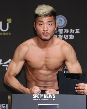 [스포티비뉴스=제주, 곽혜미 기자] ROAD FC 053 제주 계체량이 17일 오후 제주 제주시 삼도동 오리엔탈호텔에서 열렸다. 100만불 토너먼트 최종전에 참가하는 권아솔이 계체를 통과한 후 포즈를 취하고 있다.