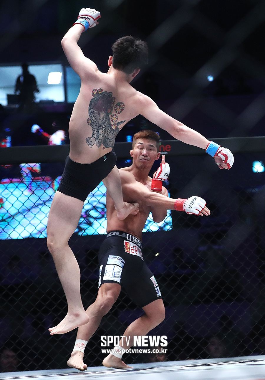 [스포티비뉴스=제주, 곽혜미 기자] 로드FC 053 제주 대회가 18일 오후 제주 제주시 오라동 한라체육관에서 열렸다. 박형근과 양지호가 경기를 펼치고 있다. 스포티비뉴스=제주, 곽혜미 기자