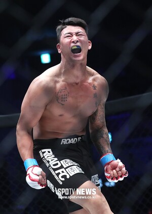 [스포티비뉴스=제주, 곽혜미 기자] 로드FC 053 제주 대회가 18일 오후 제주 제주시 오라동 한라체육관에서 열렸다. 김태인이 임동환과의 경기에서 승리를 거둔 후 포효하고 있다. 스포티비뉴스=제주, 곽혜미 기자