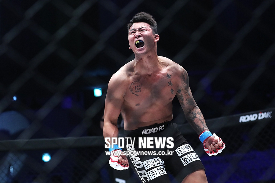 [스포티비뉴스=제주, 곽혜미 기자] 로드FC 053 제주 대회가 18일 오후 제주 제주시 오라동 한라체육관에서 열렸다. 김태인이 임동환과의 경기에서 펀치 파운딩으로 TKO승을 거둔 후 포효하고 있다. 스포티비뉴스=제주, 곽혜미 기자