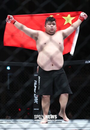[스포티비뉴스=제주, 곽혜미 기자] 로드FC 053 제주 대회가 18일 오후 제주 제주시 오라동 한라체육관에서 열렸다. 1라운드 50초 펀치 KO승을 거둔 아오르꺼러가 세리머니를 하고 있다. 스포티비뉴스=제주, 곽혜미 기자