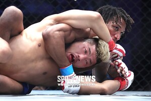 [스포티비뉴스=제주, 곽혜미 기자] 로드FC 053 제주 대회가 18일 오후 제주 제주시 오라동 한라체육관에서 열렸다. 권아솔이 만수르 바르나위에게 리어네이키드 초크를 당하며 패하고 있다. 스포티비뉴스=제주, 곽혜미 기자