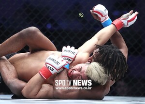 [스포티비뉴스=제주, 곽혜미 기자] 로드FC 053 제주 대회가 18일 오후 제주 제주시 오라동 한라체육관에서 열렸다. 만수르 바르나위가 권아솔에게 리어네이키드 초크 공격을 시도하고 있다.스포티비뉴스=제주, 곽혜미 기자