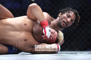 [스포티비뉴스=제주, 곽혜미 기자] 로드FC 053 제주 대회가 18일 오후 제주 제주시 오라동 한라체육관에서 열렸다. 만수르 바르나위의 리어네이키드 초크에 걸린 권아솔이 탈출을 시도하고 있다. 스포티비뉴스=제주, 곽혜미 기자
