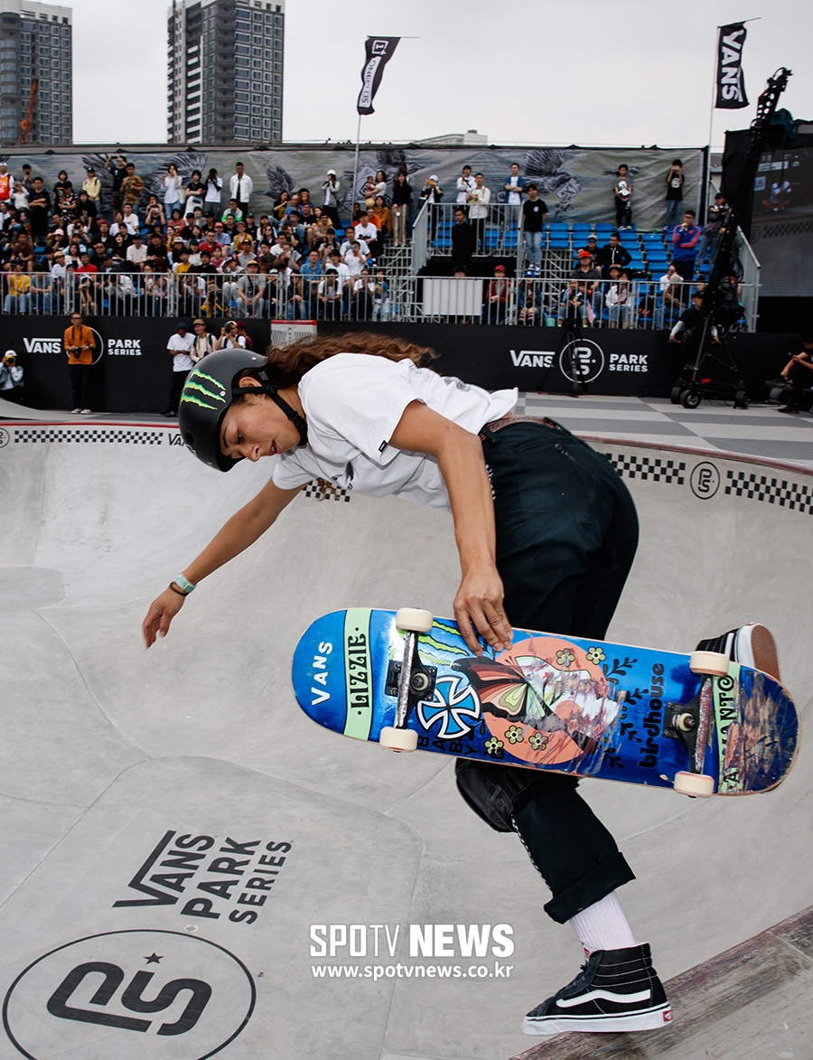 [스포티비뉴스=상하이(중국), 한희재 기자] 2019 반스 파크 시리즈 프로 투어 인 상하이(VPS)가 18일 중국 상하이 양푸 리버사이드 쉽야드 파크에서 열렸다. 리지 알만토가 스케이팅을 하고 있다. 스포티비뉴스=상하이(중국), 한희재 기자