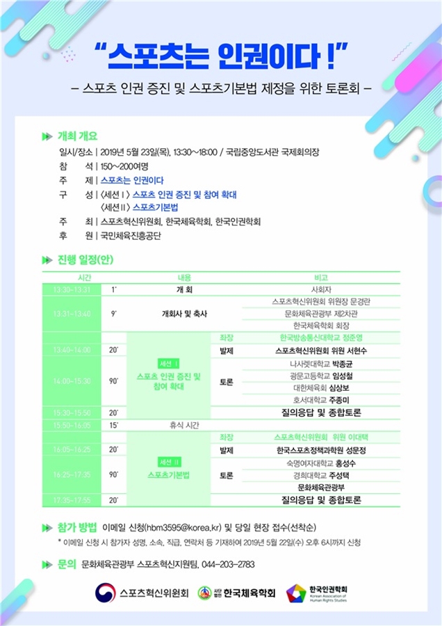 이를 통해 ‘스포츠가 인권’이라는 명제의 의미를 되짚어보고, ‘국민 모두가 누려야 할 권리’로서의 스포츠 정책 방향을 논의한다.
