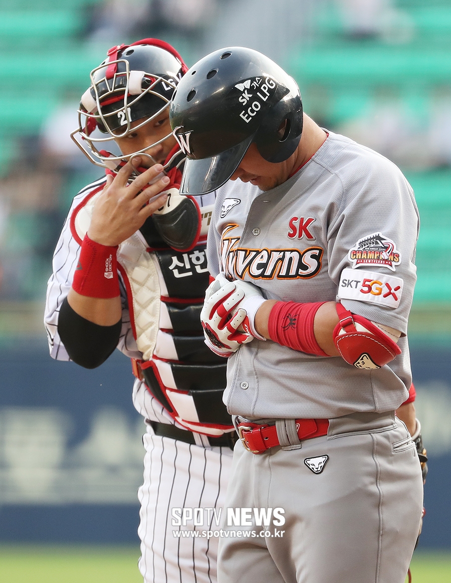 [스포티비뉴스=서울, 곽혜미 기자] 2019 신한은행 MY CAR KBO리그 LG 트윈스와 SK 와이번스의 경기가 22일 오후 서울 잠실야구장에서 열렸다. 1회초 1사 1루 상황에서 SK 최정이 몸에 맞는 볼로 고통스러워하자 LG 포수 유강남이 걱정을 하고 있다.