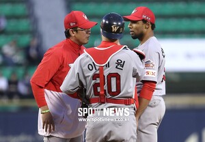 [스포티비뉴스=서울, 곽혜미 기자] 2019 신한은행 MY CAR KBO리그 LG 트윈스와 SK 와이번스의 경기가 22일 오후 서울 잠실야구장에서 열렸다. 4회말 1사 1루 상황에서 SK 산체스가 코치와 상의를 하고 있다. 사스포티비뉴스=잠실, 곽혜미 기자