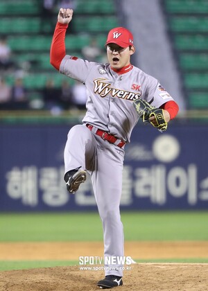 [스포티비뉴스=서울, 곽혜미 기자] 2019 신한은행 MY CAR KBO리그 LG 트윈스와 SK 와이번스의 경기가 22일 오후 서울 잠실야구장에서 열렸다. 9회말 SK 하재훈이 역투하고 있다. 스포티비뉴스=잠실, 곽혜미 기자