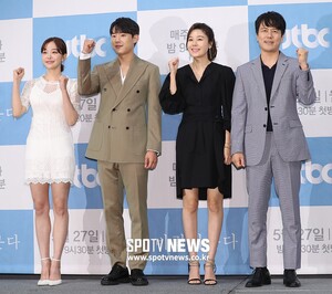 [스포티비뉴스=서울, 곽혜미 기자] JTBC 새 월화 드라마 '바람이 분다' 제작 발표회가 27일 오후 서울 강남구 논현동 임피리얼팰리스호텔에서 열렸다. 배우 김가은, 김성철, 김하늘, 감우성이 포즈를 취하고 있다. 스포티비뉴스=서울, 곽혜미 기자