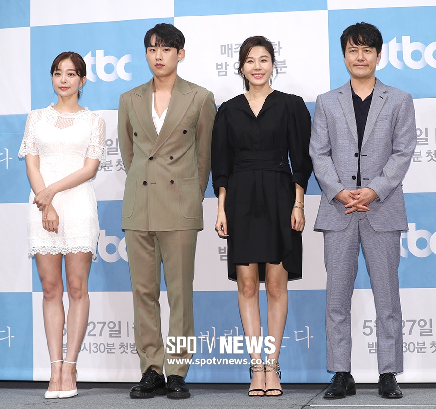 [스포티비뉴스=서울, 곽혜미 기자] JTBC 새 월화 드라마 '바람이 분다' 제작 발표회가 27일 오후 서울 강남구 논현동 임피리얼팰리스호텔에서 열렸다. 배우 김가은, 김성철, 김하늘, 감우성(왼쪽부터)이 포즈를 취하고 있다. 스포티비뉴스=서울, 곽혜미 기자
