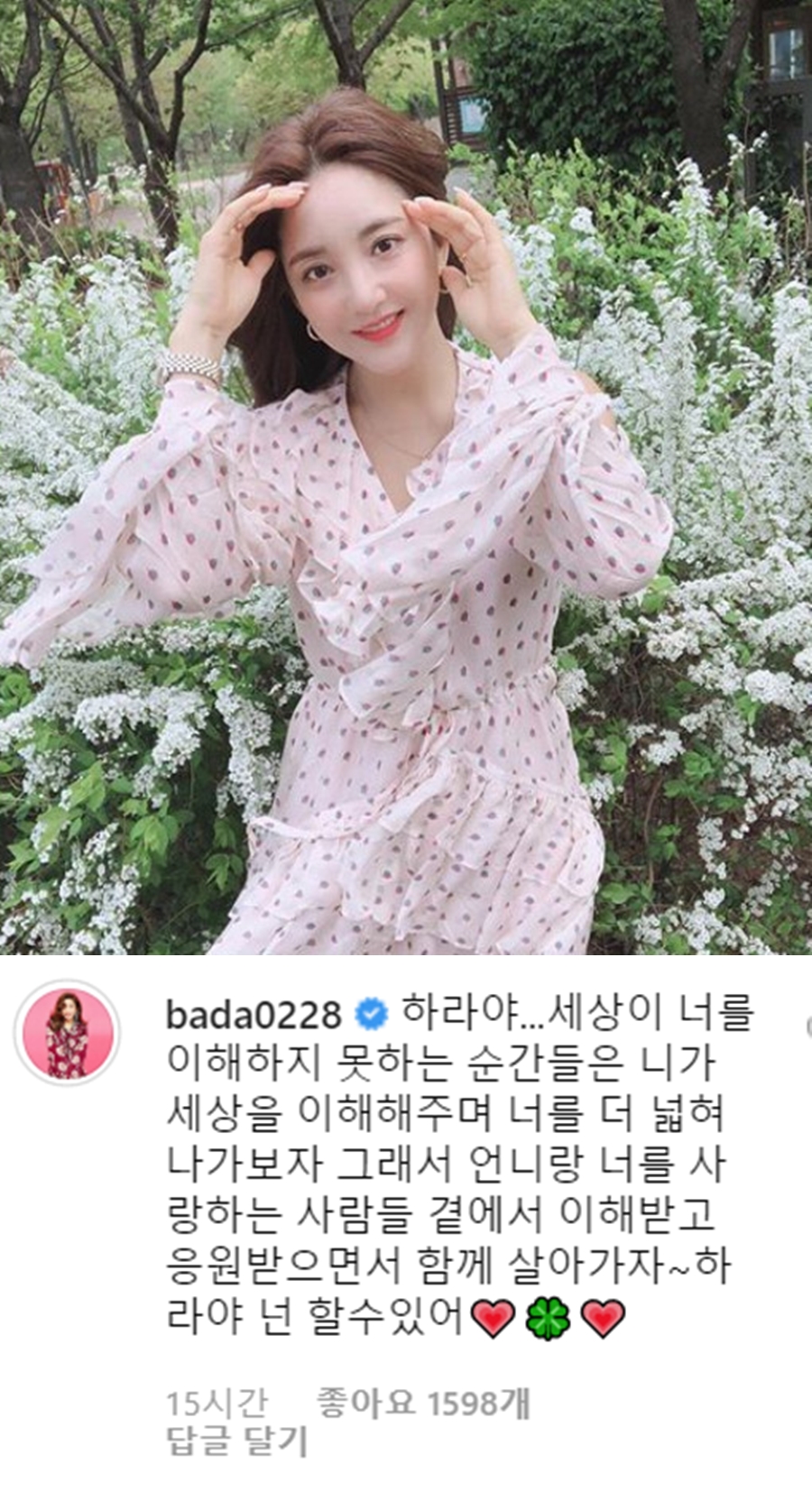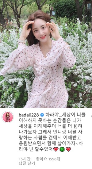 바다는 28일 구하라의 인스타그램 마지막 게시물에 "하라야... 세상이 너를 이해하지 못하는 순간들은 니가 세상을 이해해주며 너를 더 넓혀나가보자. 그래서 언니랑 너를 사랑하는 사람들 곁에서 이해받고 응원받으면서 함께 살아가자~하라야 넌 할수있어"라는 메시지를 남겼다.