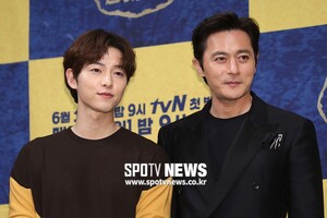 [스포티비뉴스=서울, 곽혜미 기자] tvN 토일 드라마 '아스달 연대기' 제작 발표회가 28일 오후 서울 강남구 논현동 임피리얼팰리스호텔에서 열렸다. 배우 송중기와 장동건이 포즈를 취하고 있다.