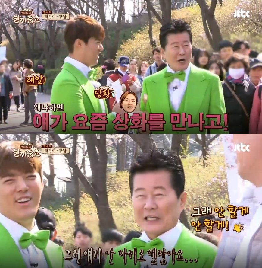 이에 지난 4월 강남과 JTBC 예능프로그램 ‘한끼줍쇼’에 출연했던 태진아가 “얘가 요즘 상화를 만나고 하도 먹어서 살이 쪘다”고 폭로한 것이 강남의 다이어트 결심과 더불어 화제가 되기도. 강남은 현재 스피드 스케이트 국가대표 선수 출신 이상화와 열애 중이다.