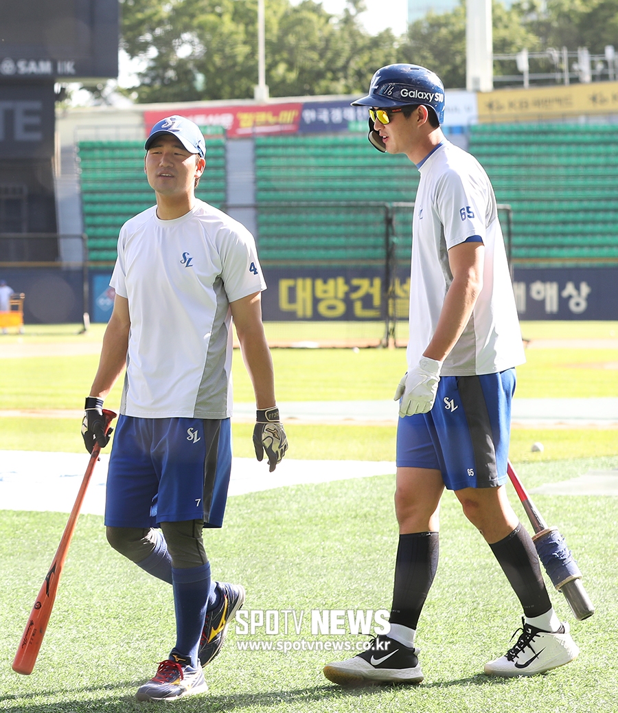 [스포티비뉴스=서울, 곽혜미 기자] 2019 신한은행 MY CAR KBO리그 두산 베어스와 삼성 라이온즈의 경기가 29일 오후 서울 잠실야구장에서 열린다. 삼성 김상수와 구자욱이 대화를 나누고 있다. 스포티비뉴스=잠실, 곽혜미 기자