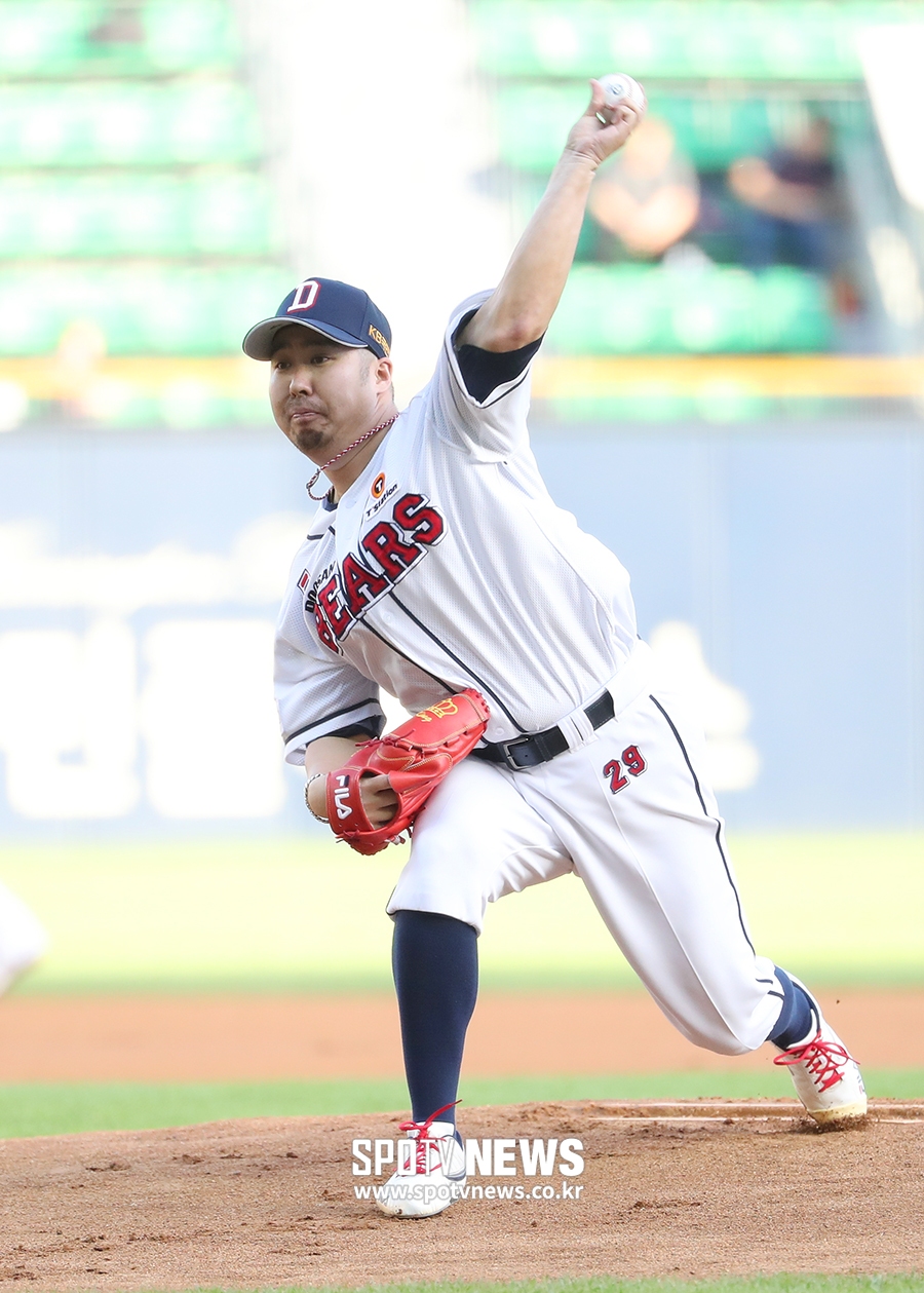 [스포티비뉴스=서울, 곽혜미 기자] 2019 신한은행 MY CAR KBO리그 두산 베어스와 삼성 라이온즈의 경기가 29일 오후 서울 잠실야구장에서 열렸다. 두산 선발 유희관이 역투하고 있다. 스포티비뉴스=잠실, 곽혜미 기자