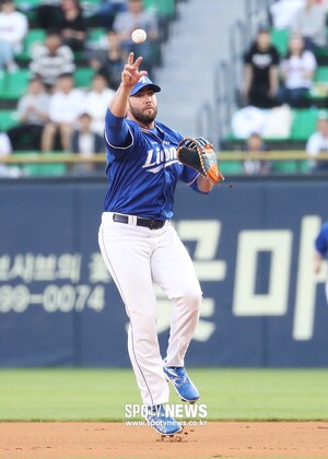 [스포티비뉴스=서울, 곽혜미 기자] 2019 신한은행 MY CAR KBO리그 두산 베어스와 삼성 라이온즈의 경기가 29일 오후 서울 잠실야구장에서 열렸다. 1회말 선두타자로 나선 두산 정수빈의 타구를 삼성 1루수 러프가 잡아 베이스커버를 들어오고 있는 투수에게 송구하고 있다.스포티비뉴스=잠실, 곽혜미 기자