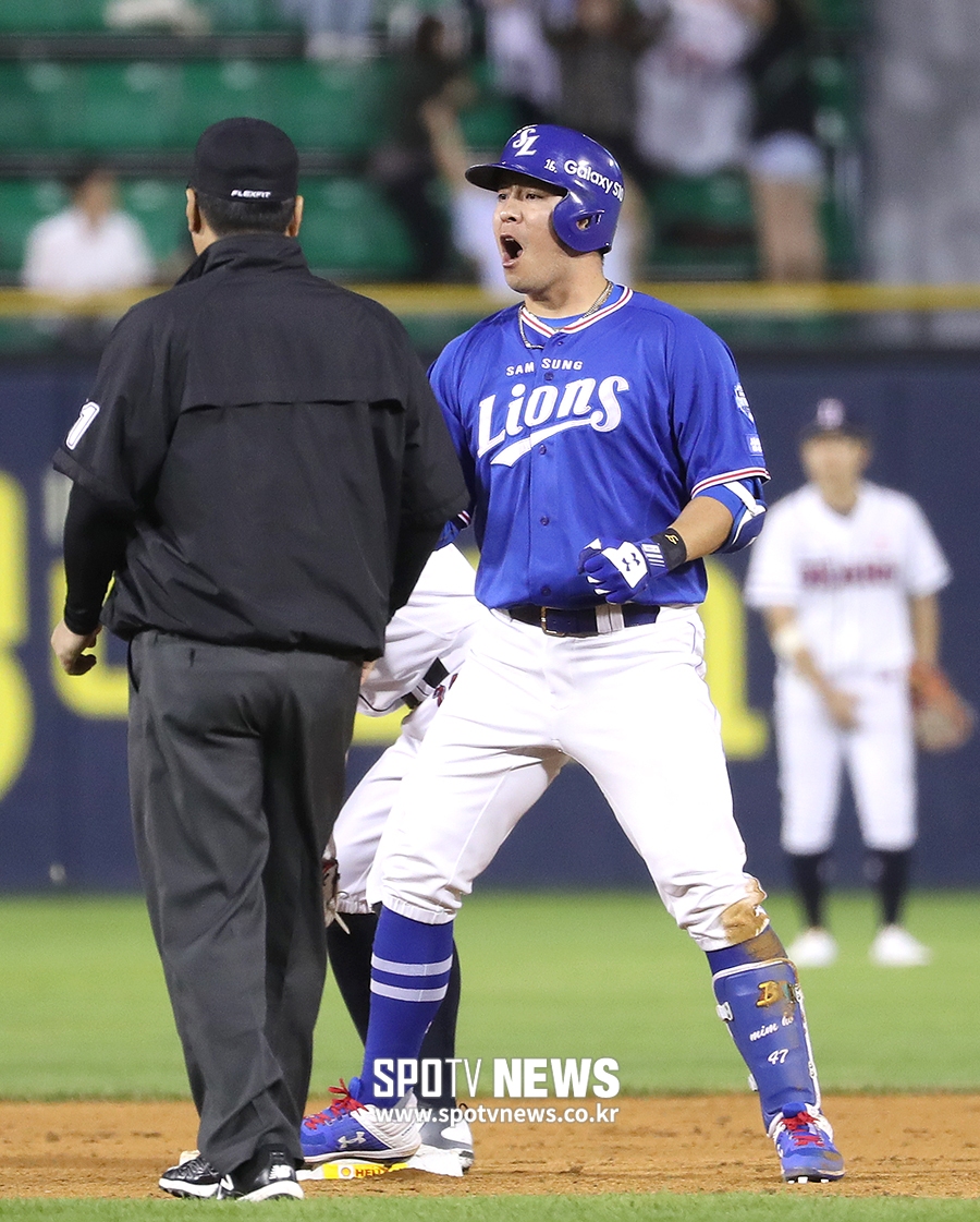 [스포티비뉴스=서울, 곽혜미 기자] 2019 신한은행 MY CAR KBO리그 두산 베어스와 삼성 라이온즈의 경기가 29일 오후 서울 잠실야구장에서 열렸다. 9회초 1사 2루 상황에서 짜릿한 동점 1타점 2루타를 날린 삼성 강민호가 포효하고 있다.스포티비뉴스=잠실, 곽혜미 기자