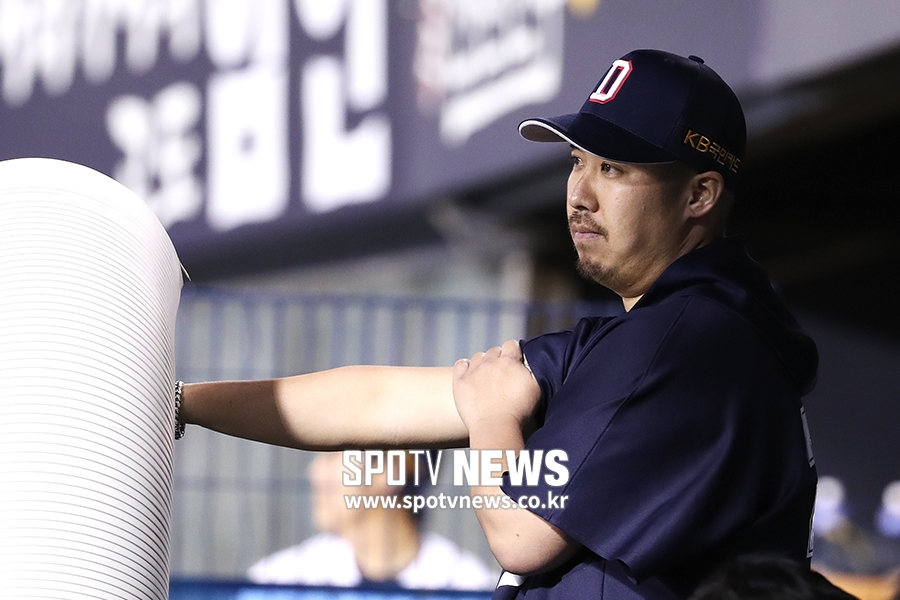 [스포티비뉴스=서울, 곽혜미 기자] 2019 신한은행 MY CAR KBO리그 두산 베어스와 삼성 라이온즈의 경기가 29일 오후 서울 잠실야구장에서 열렸다. 9회말 1사 2,3루 상황에서 두산 유희관이 그라운드를 바라보고 있다. 스포티비뉴스=잠실, 곽혜미 기자