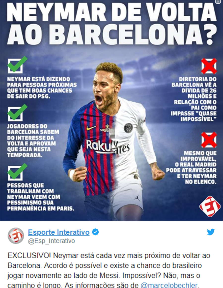 브라질 매체 ‘에스포르테 인터라티보’의 마르셀로 베슬러가 네이마르의 바르셀로나 복귀에 한 표를 던졌다. 베슬러는 2017년 네이마르의 파리 생제르맹 이적을 보도한 기자다. 매체도 자사 기자 소식을 발 빠르게 트위터로 옮겼다.