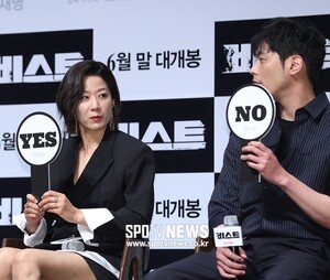 [스포티비뉴스=서울, 곽혜미 기자] 영화 '비스트' 제작 보고회가 30일 오전 서울 강남구 압구정CGV에서 열렸다. 배우 전혜진이 최다니엘을 바라보고 있다. 스포티비뉴스=서울, 곽혜미 기자