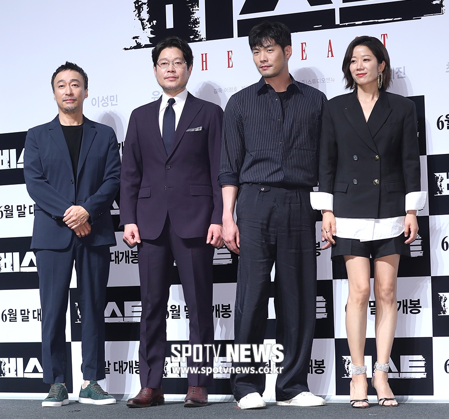 [스포티비뉴스=서울, 곽혜미 기자] 영화 '비스트' 제작 보고회가 30일 오전 서울 강남구 압구정CGV에서 열렸다. 배우 이성민, 유재명, 최다니엘, 전혜진(왼쪽부터)이 포즈를 취하고 있다. 스포티비뉴스=서울, 곽혜미 기자