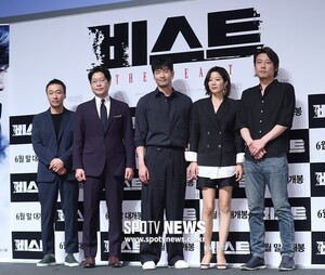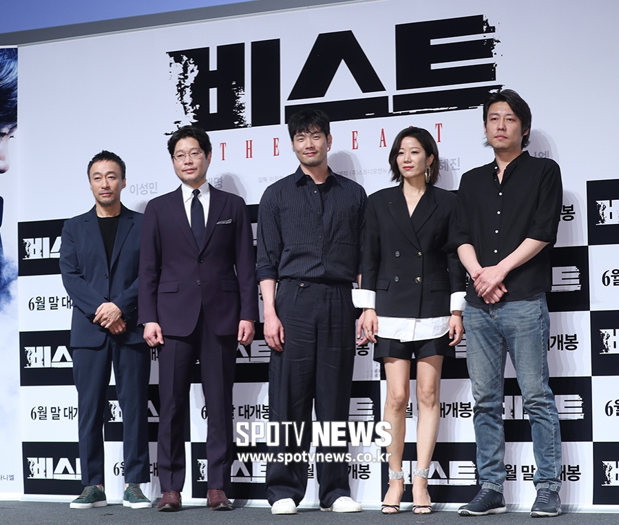 [스포티비뉴스=서울, 곽혜미 기자] 영화 '비스트' 제작 보고회가 30일 오전 서울 강남구 압구정CGV에서 열렸다. 배우 이성민, 유재명, 최다니엘, 전혜진, 이정호 감독(왼쪽부터)이 포즈를 취하고 있다. 스포티비뉴스=서울, 곽혜미 기자