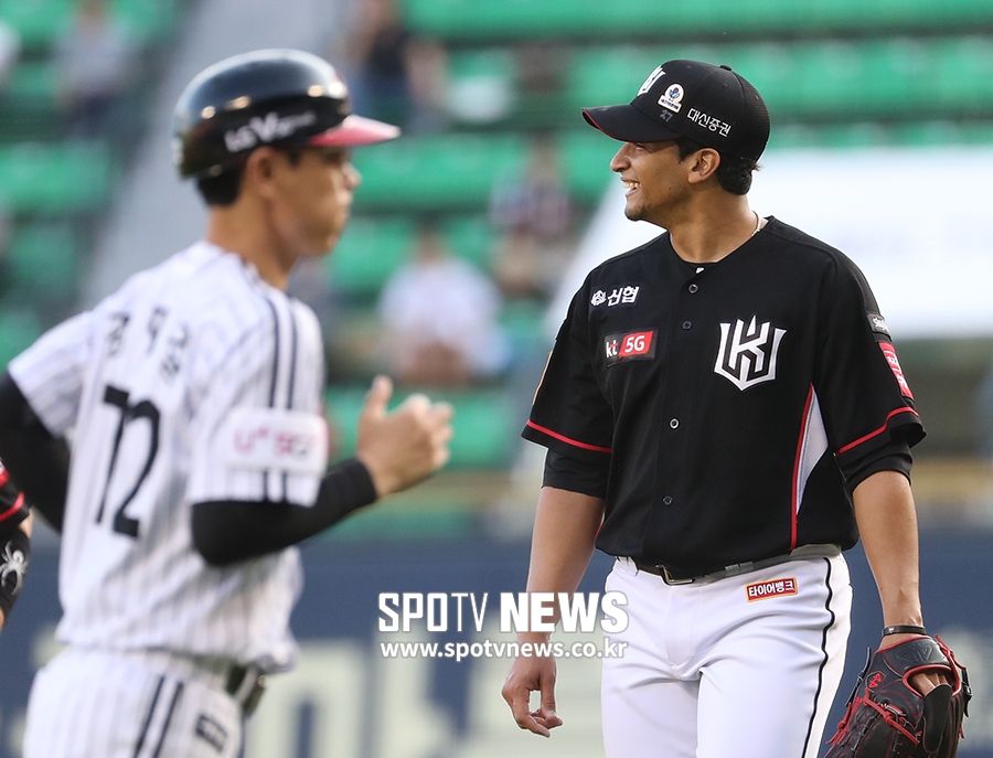 [스포티비뉴스=잠실, 곽혜미 기자] 2019 신한은행 MY CAR KBO리그 LG 트윈스와 KT 위즈의 경기가 4일 오후 서울 잠실야구장에서 열렸다. 1회말 삼자범퇴로 이닝을 종료한 KT 선발 쿠에바스가 미소를 지으며 그라운드를 내려오고 있다.스포티비뉴스=잠실, 곽혜미 기자