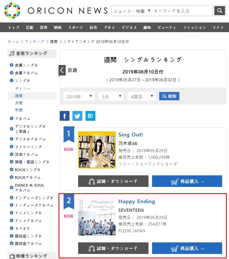 지난달 29일 발매한 세븐틴의 일본 싱글 ‘해피 엔딩’이 5일 발표한 일본 최대 음반 집계사이트인 오리콘에서 발매 첫 주 만에 25만 4877장의 높은 판매고를 올리며 위클리 싱글 랭킹 2위에 등극, 오리콘 주간 합산 싱글 랭킹에서도 2위를 차지하며 '대세돌'로서의 면모를 과시했다.