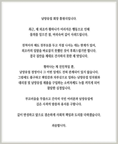이어 “친척이라 해도 친부모를 두고 직접 나서는 데는 한계가 있어 외조카의 일탈을 바로잡지 못했던 것이 후회스럽기만 하다”며 “결국 집안을 제대로 건사하지 못한 제 탓”이라며 “외조카 황하나가 어리석은 행동으로 인해 물의를 일으킨 점, 머리숙여 깊이 사죄드린다. 부끄러움을 무릅쓰고 간곡히 국민 여러분과 남양유업에 깊은 사죄의 말씀과 용서를 구한다”고 사과했다.