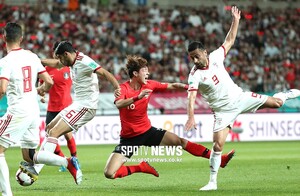 [스포티비뉴스=서울, 곽혜미 기자] 대한민국 축구대표팀과 이란 대표팀의 평가전이 11일 오후 서울월드컵경기장에서 열렸다. 황의조가 수비에 막히고 있다. 스포티비뉴스=서울, 곽혜미 기자