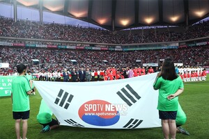 [스포티비뉴스=서울, 곽혜미 기자] 대한민국 축구대표팀과 이란 대표팀의 평가전이 11일 오후 서울월드컵경기장에서 열렸다. 대표팀 선수들이 애국가를 부르고 있다. 스포티비뉴스=서울, 곽혜미 기자
