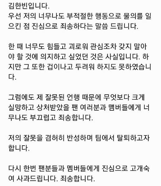 그는 "그럼에도 제 잘못된 언행 때문에 무엇보다 크게 실망하고 상처받았을 팬 여러분과 멤버들에게 너무나도 부끄럽고 죄송합니다"라며 "저의 잘못을 겸허히 반성하며 팀에서 탈퇴하고자 합니다. 다시 한번 팬분들과 멤버들에게 진심으로 고개 숙여 사과드립니다. 죄송합니다."라고 사과의 메시지를 전함과 동시에 그룹을 탈퇴한다는 입장을 밝혔다.