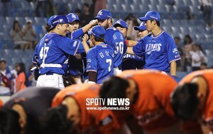[스포티비뉴스=대전, 곽혜미 기자] 2019 신한은행 MY CAR KBO리그 한화 이글스와 삼성 라이온즈의 경기가 21일 오후 대전 한화생명이글스파크에서 열렸다. 5-2로 승리한 삼성 선수들이 승리의 기쁨을 나누고 있다. 스포티비뉴스=대전, 곽혜미 기자