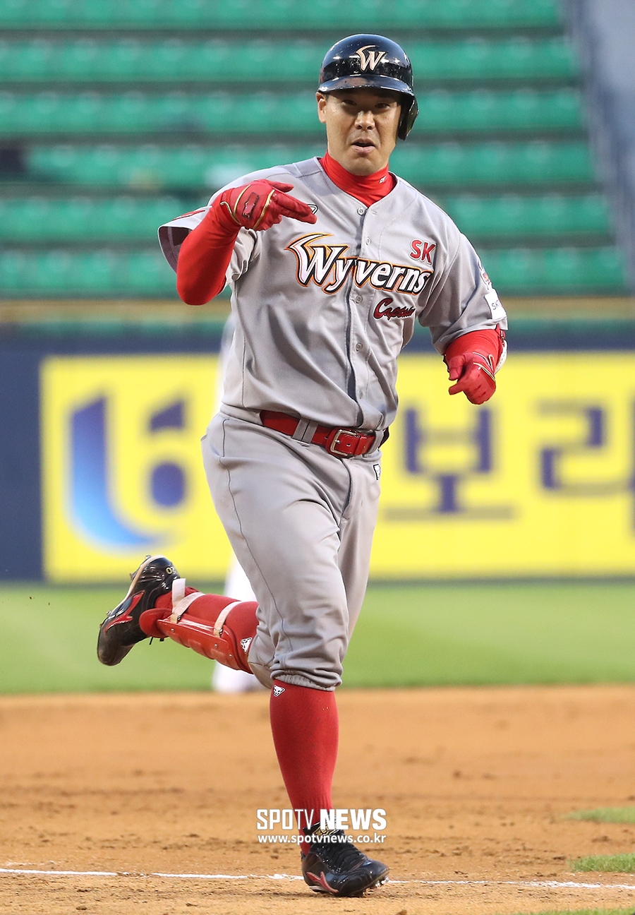 [스포티비뉴스=잠실, 곽혜미 기자] 2019 신한은행 MY CAR KBO리그 LG 트윈스와 SK 와이번스의 경기가 25일 오후 서울 잠실야구장에서 열렸다. 4회초 1사 1루 상황에서 SK 이재원이 역전 투런포를 날린 후 더그아웃을 바라보며 홈으로 향하고 있다.스포티비뉴스=잠실, 곽혜미 기자