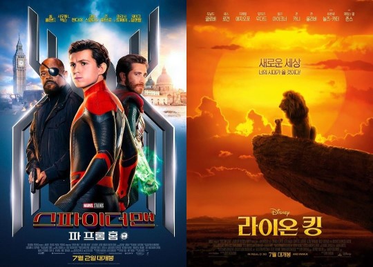 오는 17일 개봉하는 '라이온 킹'이 '스파이더맨: 파 프롬 홈'의 흥행 독주를 막을지 관심이 쏠린다. 이날 오전 기준 '라이온 킹'은 점유율 60.6%를 보이며 예매율 1위에 올랐다. '스파이더맨: 파 프롬 홈'은 그 뒤를 이어 점유율 8.2%, 예매율 2위를 기록했다.