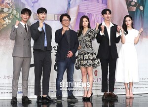 [스포티비뉴스=서울, 곽혜미 기자] MBC 새 수목 미니시리즈 '신입사관 구해령' 제작 발표회가 17일 오후 서울 마포구 상암동 MBC 골든마우스홀에서 열렸다. 배우 박기웅, 차은우, 강일수 감독, 신세경, 이지훈, 박지현(왼쪽부터)이 포즈를 취하고 있다. 스포티비뉴스=서울, 곽혜미 기자
