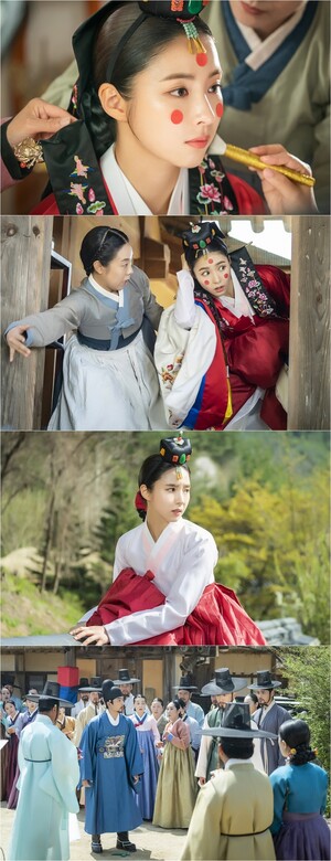 공개된 사진 속에는 신부 치장을 받는 해령의 모습이 담겼다. 연지곤지를 찍고 족두리, 전통 혼례복으로 새 신부 비주얼을 완성한 해령은 기쁜 미소는커녕 영혼 없는 표정으로 치장을 받고 있어 호기심을 높인다.