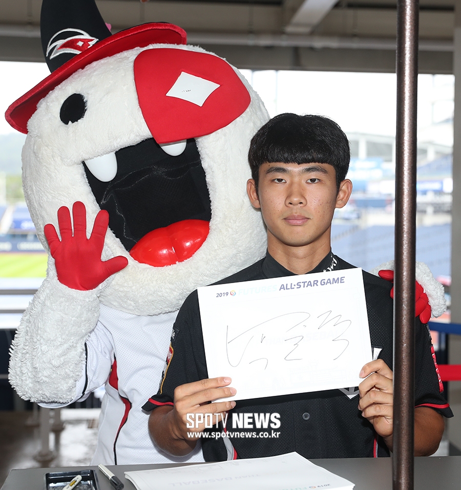 [스포티비뉴스=창원, 곽혜미 기자] 19일 오후 창원NC파크에서 열릴 예정이었던 2019 KBO 퓨처스리그 올스타전이 우천으로 연기가 됐다. KT 박준혁이 팬사인회에서 포즈를 취하고 있다. 스포티비뉴스=창원, 곽혜미 기자