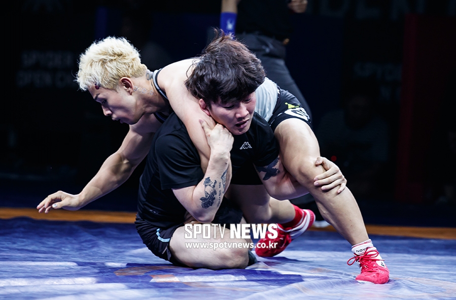 [스포티비뉴스=서울, 한희재 기자] 스파이더 레슬링 오픈 챔피언십이 20일 서울 서초구 양재동 서초종합체육관에서 열렸다. 김슬기(파란색)와 케빈박(붉은색)이 대결하고 있다. 스포티비뉴스=서울, 한희재 기자