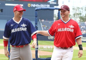 [스포티비뉴스=창원, 곽혜미 기자] 2019 KBO 리그 올스타전이 21일 오후 창원NC파크에서 열린다. 홈런 레이스 결승에 오른 로맥과 샌즈가 기념 촬영을 하고 있다.스포티비뉴스=창원, 곽혜미 기자