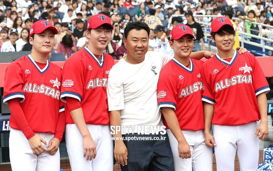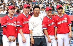 [스포티비뉴스=창원, 곽혜미 기자] 2019 KBO 리그 올스타전이 21일 오후 창원NC파크에서 열린다. 은퇴를 한 이범호가 KIA 후배들과 기념 촬영을 하고 있다. 스포티비뉴스=창원, 곽혜미 기자